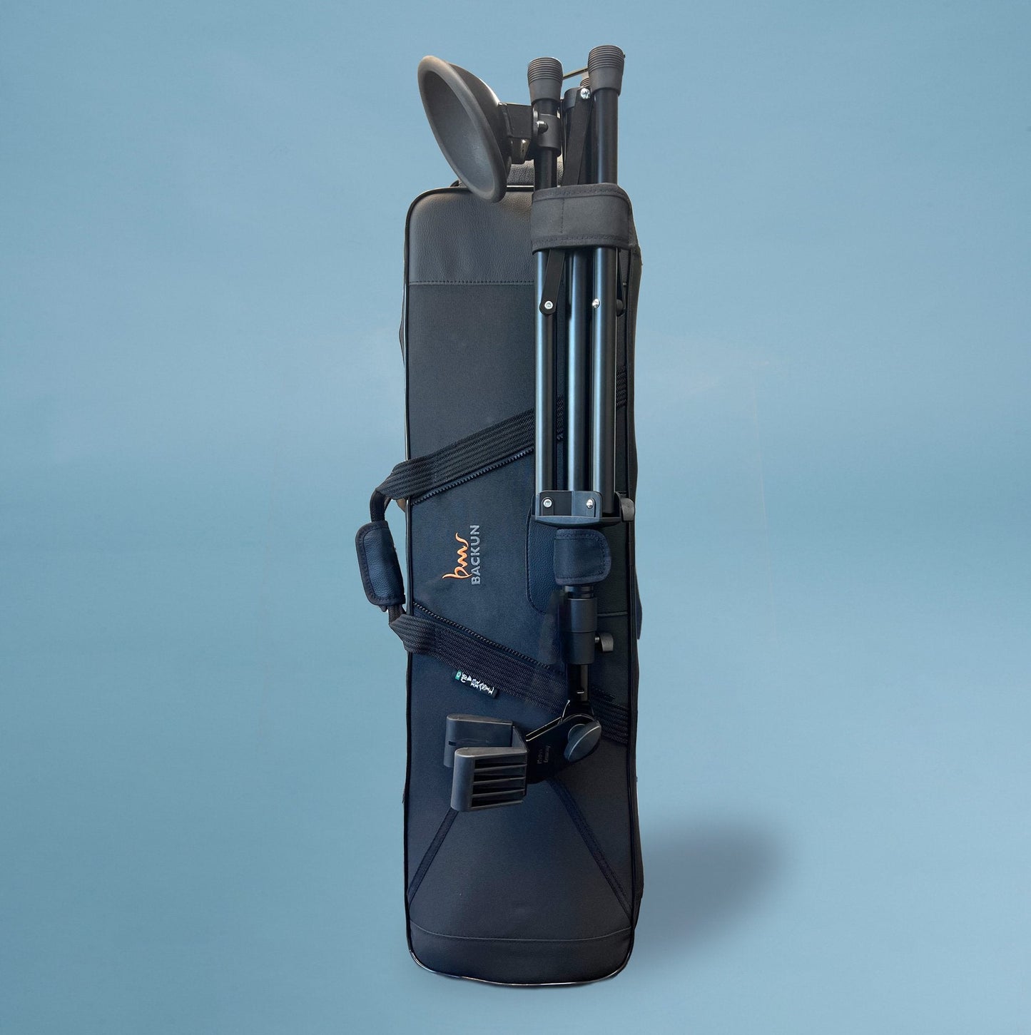 The case is a custom job designed by Marcus Bonna with input from Joel Jaffe and me. Small, lightweight, and thoughtfully designed, it has an external strap system made to hold the K+M Bass Clarinet stand.