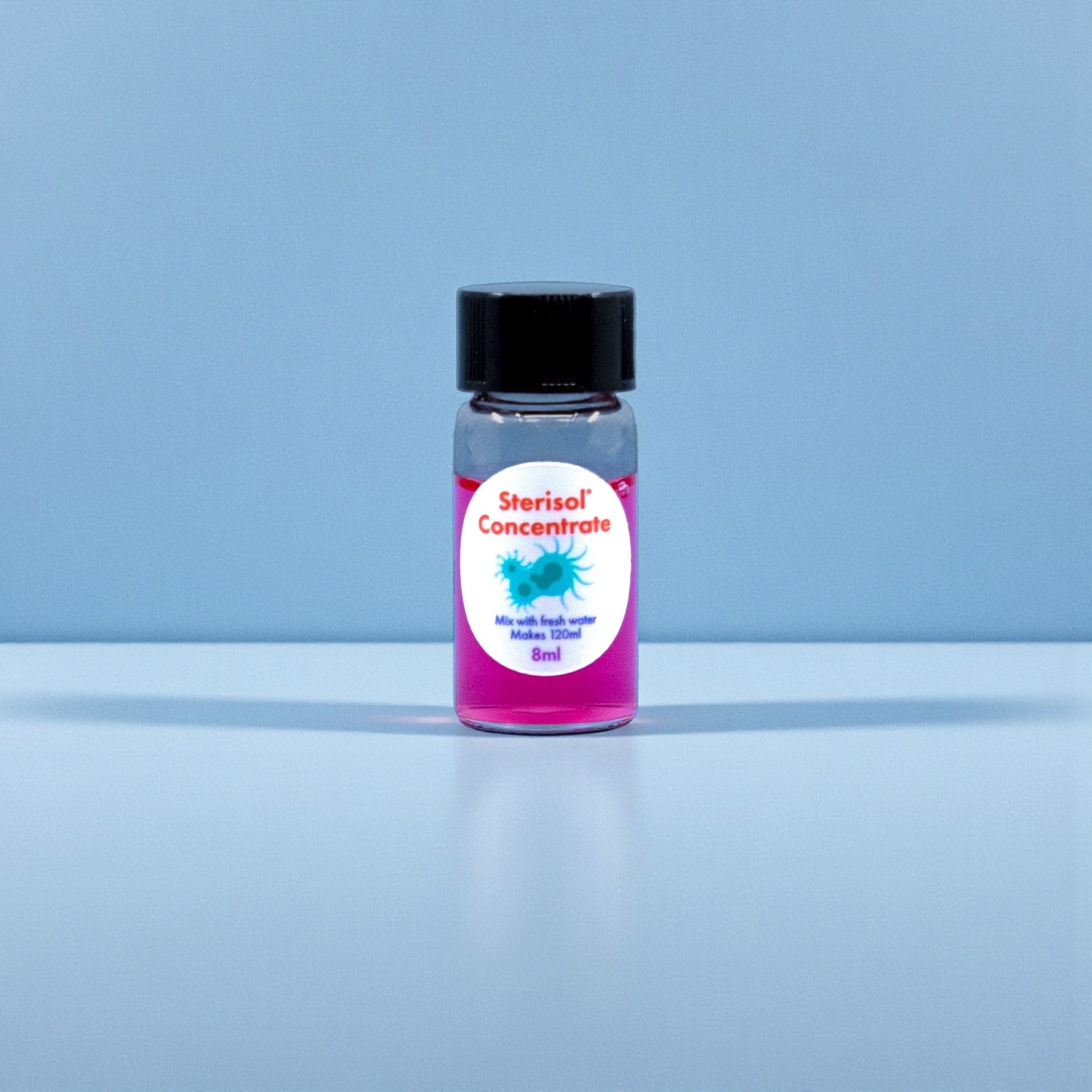 Just take this vial, empty it into the spray bottle, fill to line with clean tap water, and start murdering those germs again. 8ml glass bottle.