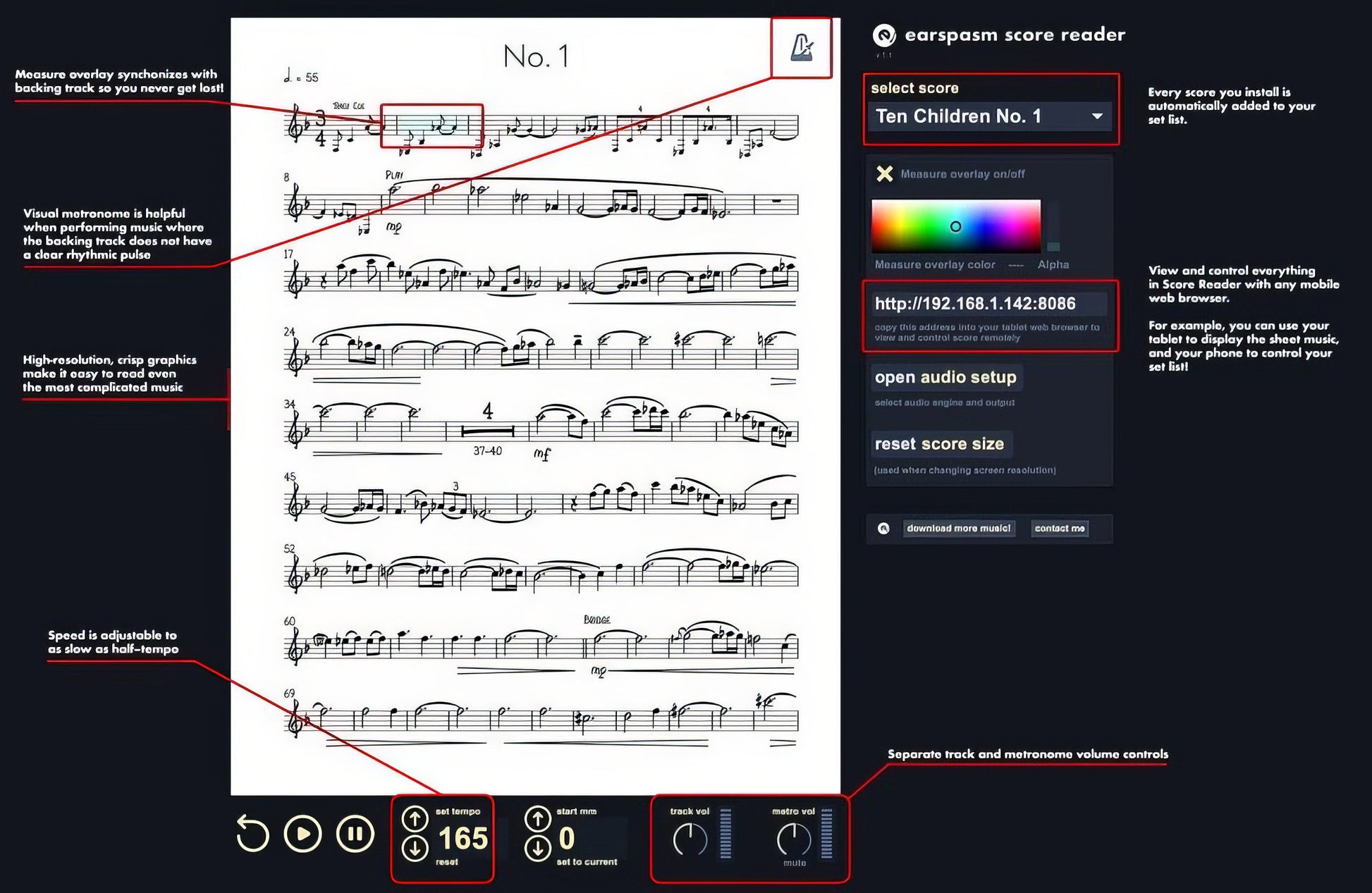 Simply install the software, and then just install any of the supported Score Reader pieces on my site (see below for list), fire up the app, and you'll be good to go. This download comes with one free piece pre-loaded (Ten Children #1) so you can see how it works.