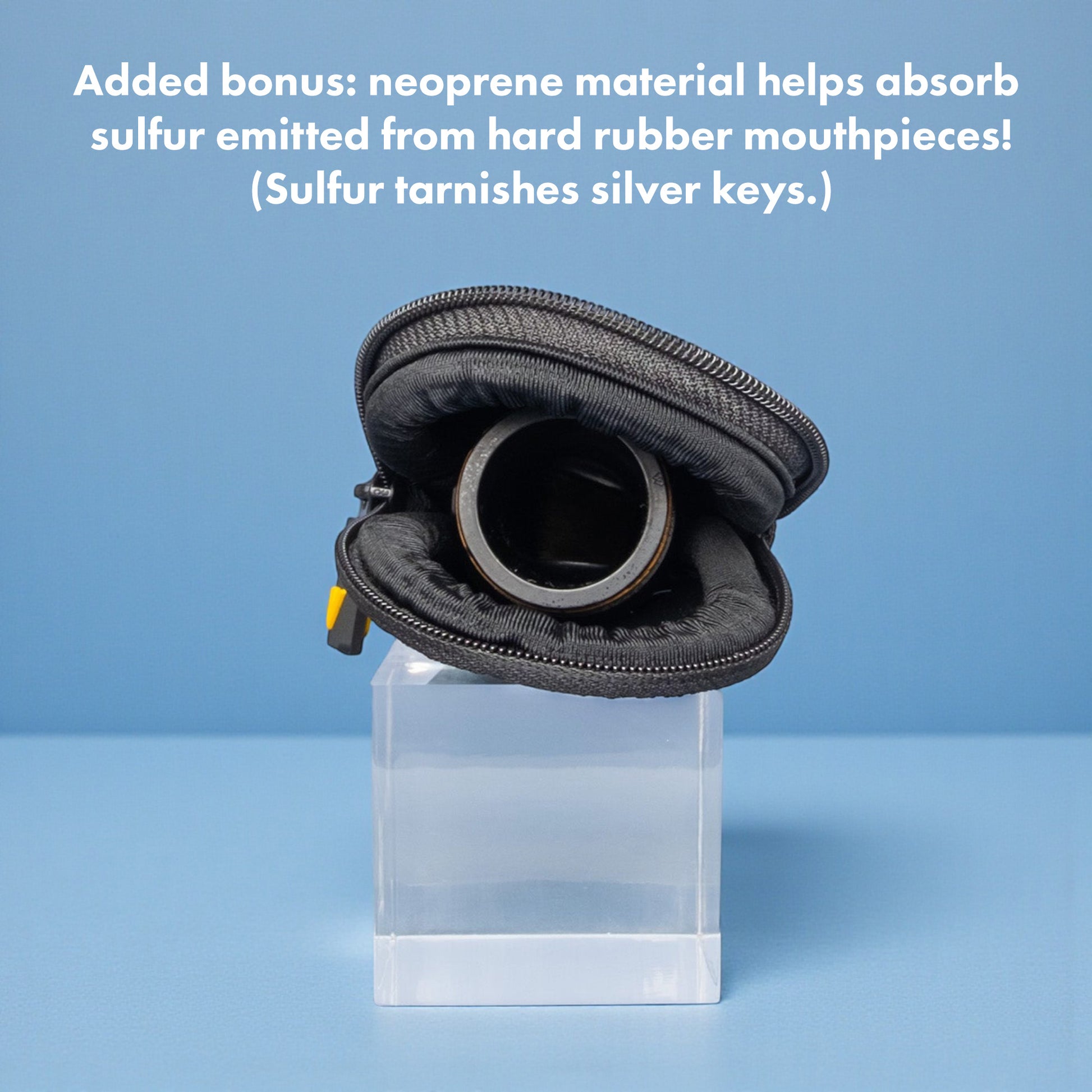 Aaaaaand, as an added bonus, when it's zipped up, it actually reduces the sulfur fumes that every hard rubber mouthpiece emits. Who cares? I care, because sulfur is a silver-tarnishing agent. And I like my silver keys to be, you know, silver.